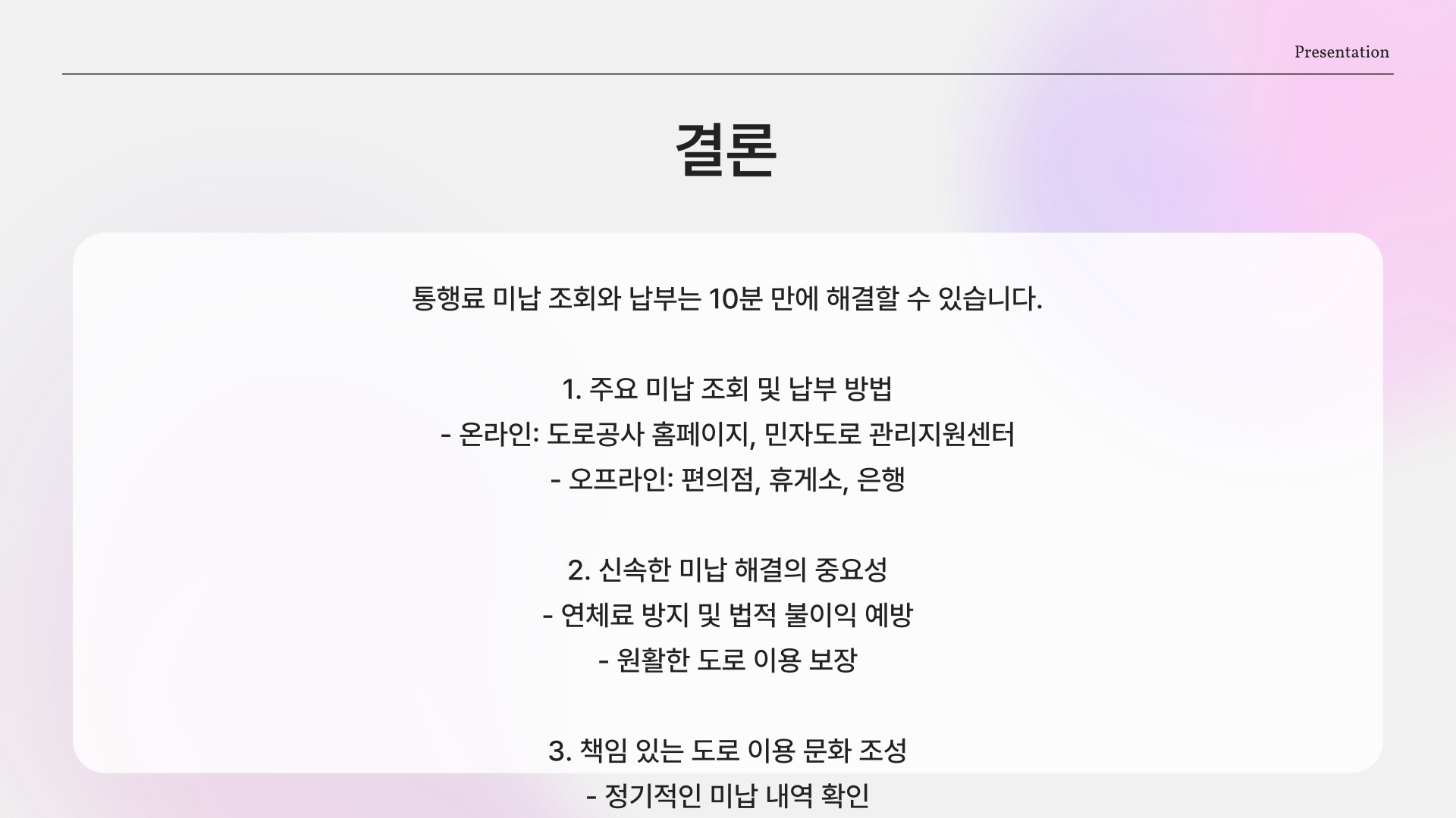 위의 내용을 참고하여 통행료 미납 문제를 간편하게 해결하시기 바랍니다. 매번 점검하는 습관을 들인다면, 예기치 않은 비용 부담을 줄일 수 있습니다.