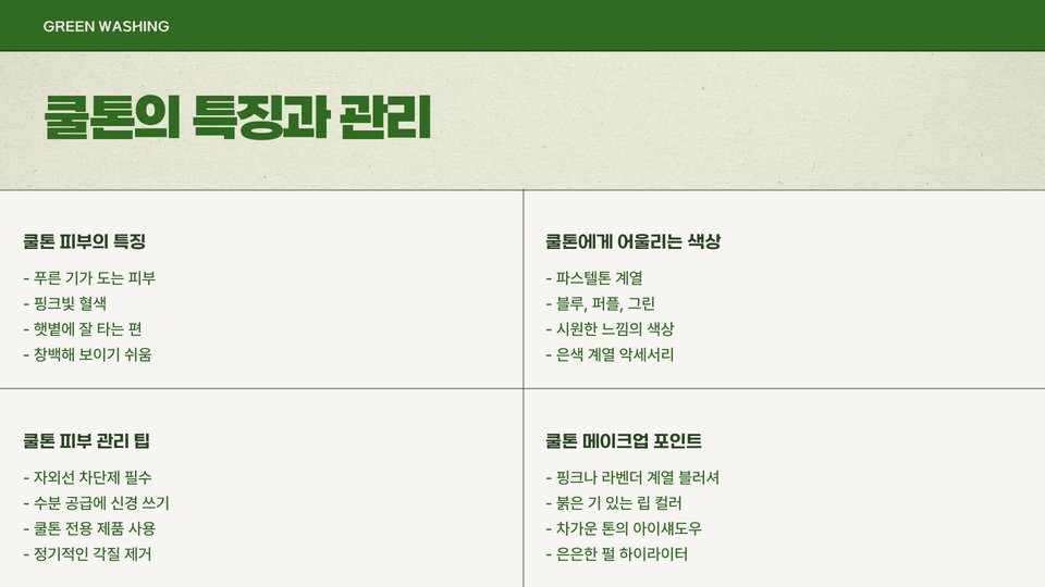 - 피부톤은 쿨톤, 웜톤, 뉴트럴톤으로 구분된다.