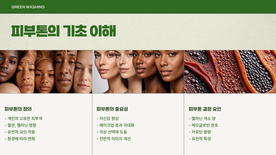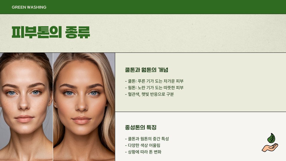 먼저, 피부톤의 기본적인 정의부터 살펴보겠습니다. 피부톤은 피부의 색과 그 아래에 있는 색조를 포함한 피부의 전체적인 색상을 의미합니다. 일반적으로 피부톤은 세 가지 유형으로 나뉩니다: 쿨톤, 웜톤, 뉴트럴톤입니다. 이러한 톤은 피부의 기초적인 색상 외에도, 개인의 혈관색, 머리카락과 눈의 색과 같은 여러 요인에 따라 결정됩니다.