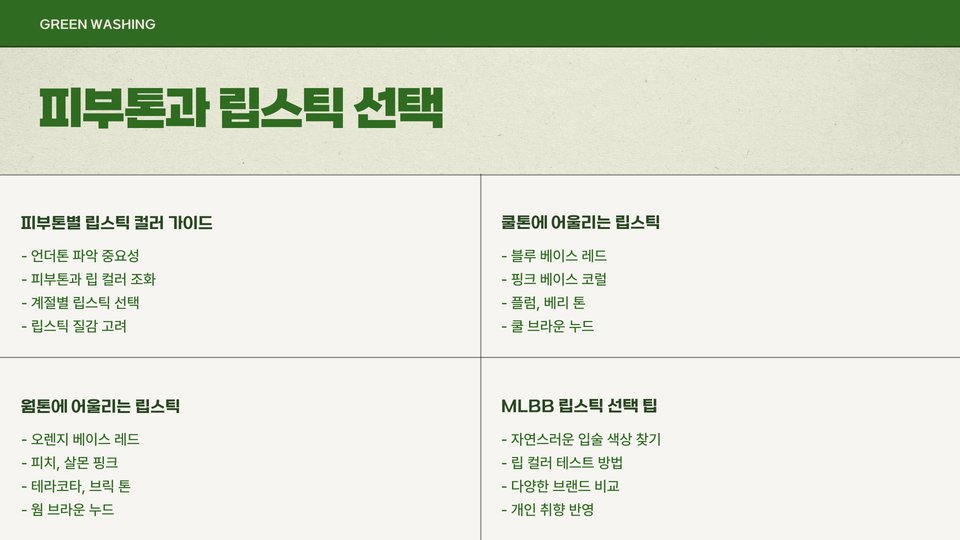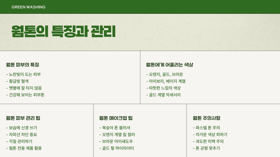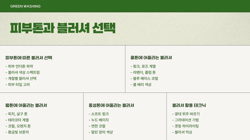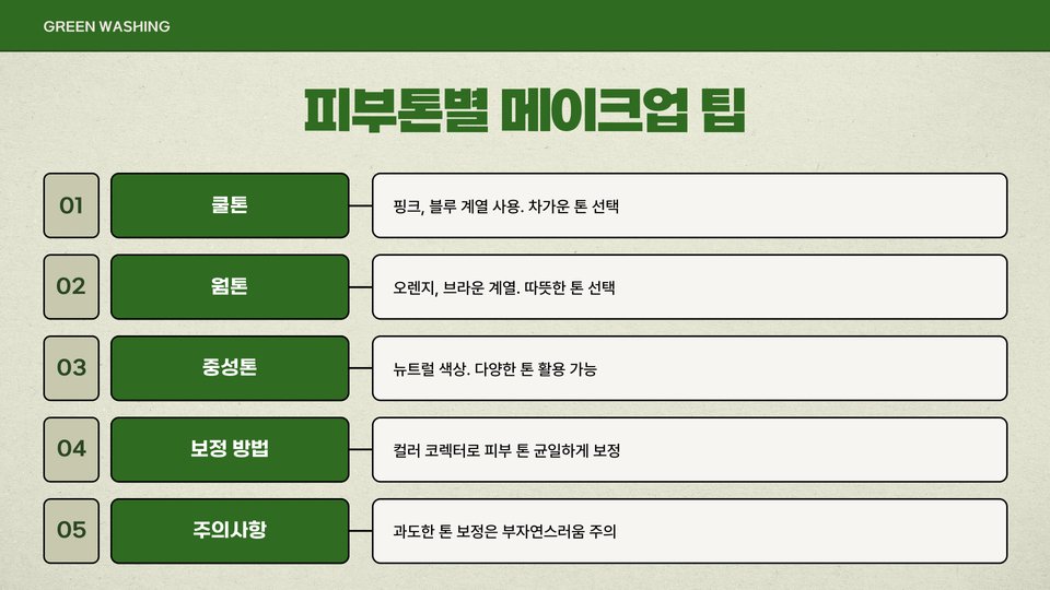 - 웜톤: 따뜻한 색조의 블러셔, 오렌지 또는 적갈색 립스틱 추천