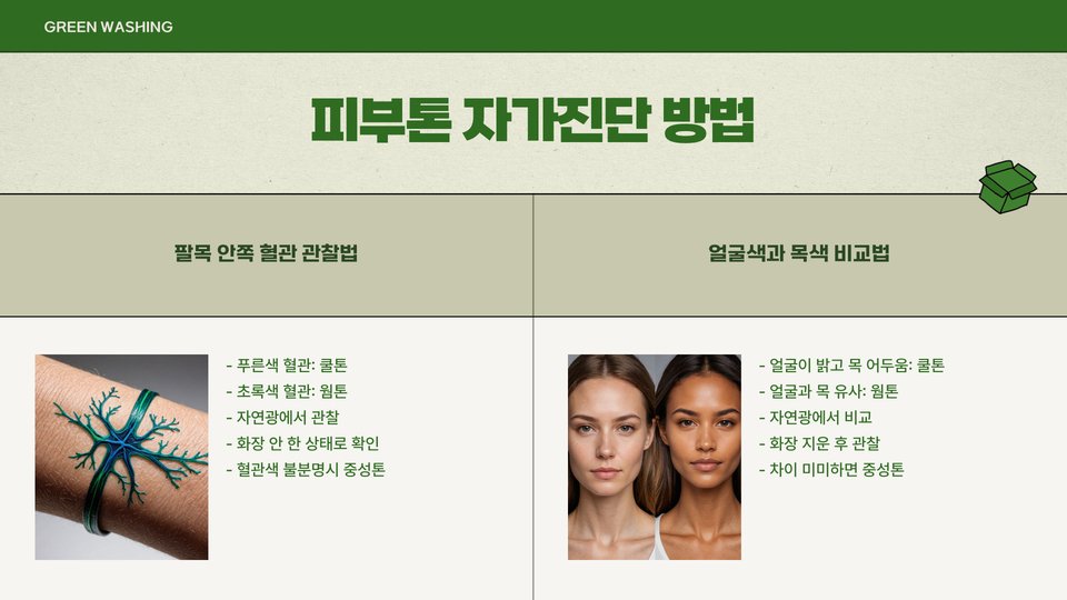 자신의 피부톤을 확인하는 방법에는 여러 가지가 있습니다. 가장 간단한 방법은 정맥 검사입니다. 손목의 정맥 색깔을 확인해보세요. 푸른 정맥이 보인다면 쿨톤일 가능성이 높고, 녹색 정맥이 보인다면 웜톤일 수 있습니다. 또한, 제스처 테스트를 통해 옷이나 화장품의 색이 자신의 피부에 잘 어울리는지를 확인할 수 있습니다.