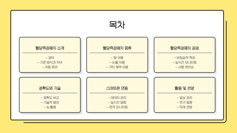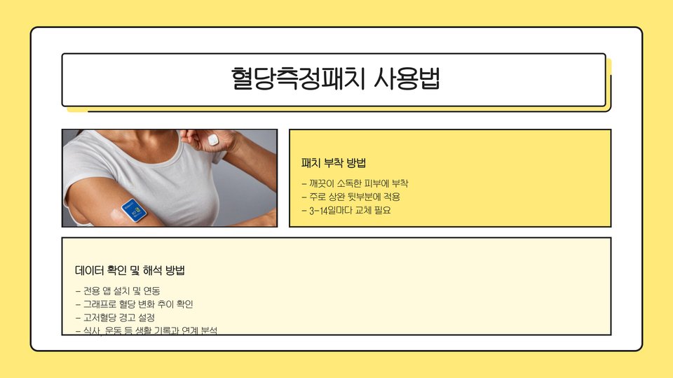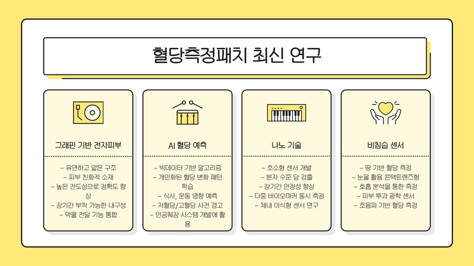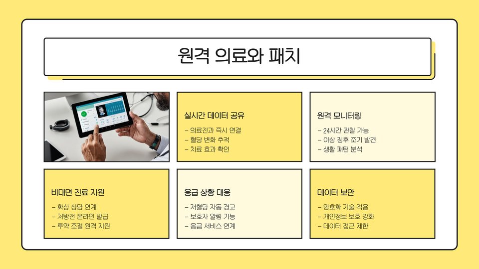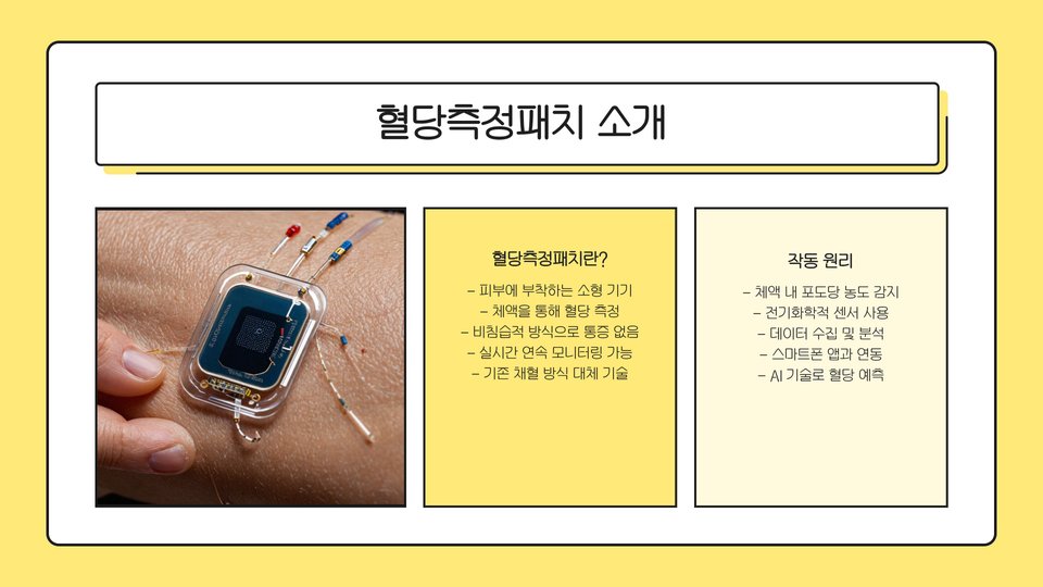 - 혈당패치는 손가락을 찌르지 않고 혈당을 측정할 수 있는 혁신적인 장치입니다.
