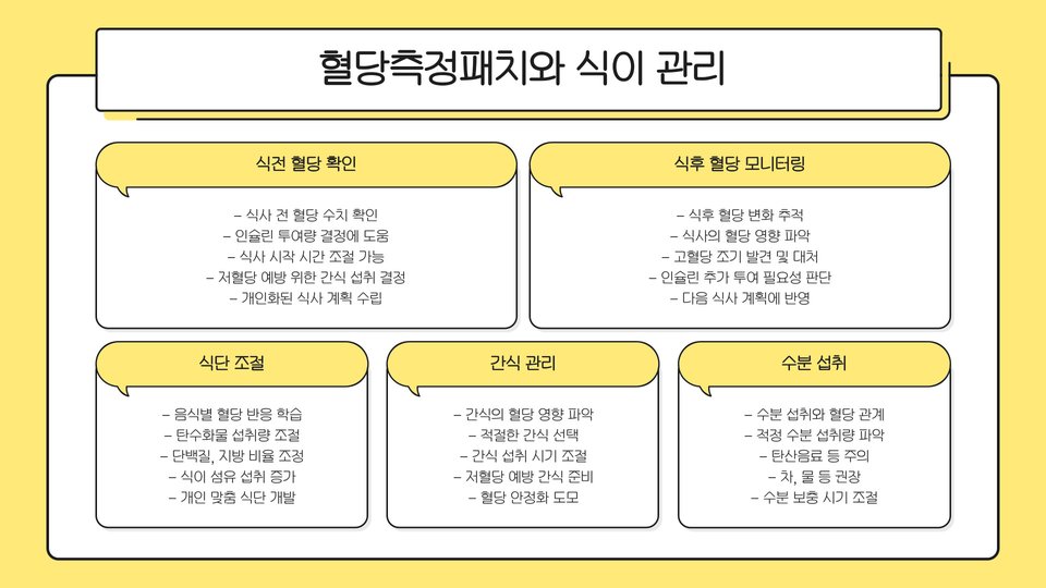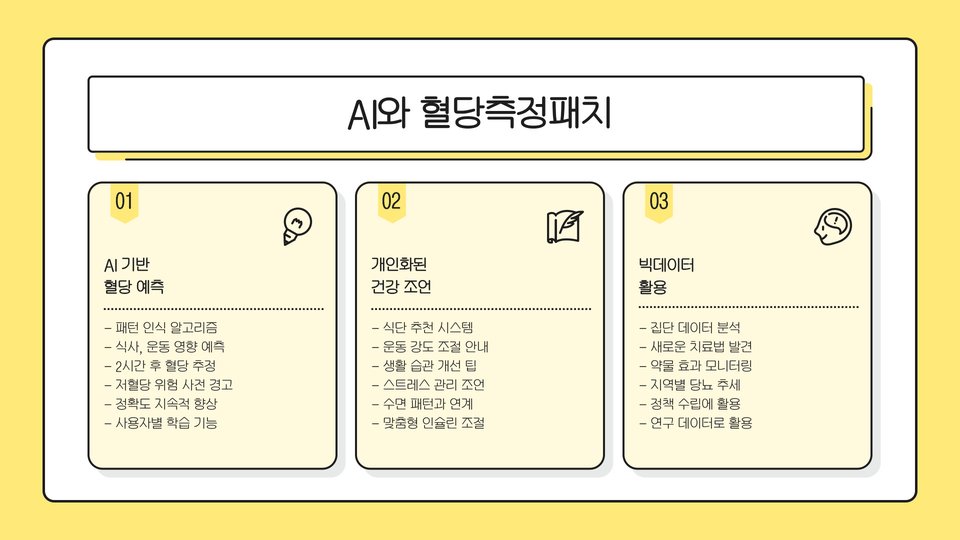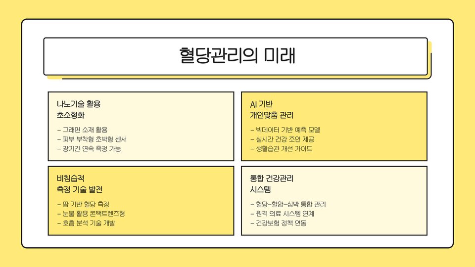 혈당패치 기술은 계속 발전하고 있으며, 앞으로 더 많은 기능과 편의성이 추가될 것으로 예상됩니다. 예를 들어, 인공지능(AI) 기반 알고리즘을 통해 예측 분석 기능이 추가될 수 있습니다. 이는 사용자가 자신의 혈당 수치를 기반으로 미래의 혈당 변화를 예측하고, 이를 관리할 수 있는 기회를 제공합니다. 혈당패치의 발전은 당뇨병 관리에 혁신적인 변화를 가져올 것입니다.