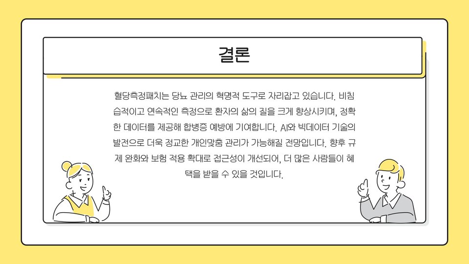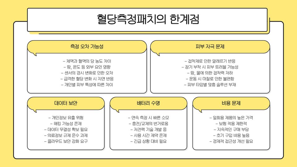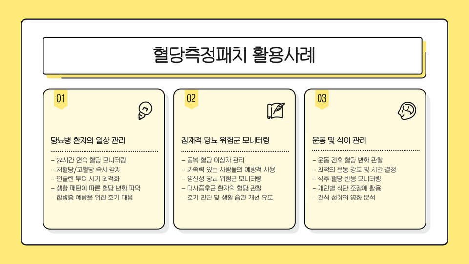 결국, 혈당측정패치는 당뇨 관리의 편리함을 대폭 향상시킬 수 있는 장비입니다. 기존의 방법에 비해 혈당 모니터링을 보다 쉽고 안전하게 수행할 수 있는 것이 큰 이점입니다.
