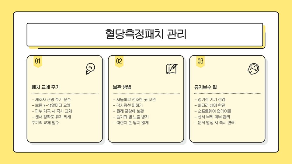 혈당패치는 매우 유용하지만, 몇 가지 주의사항이 있습니다. 우선, 패치를 부착하기 전에 피부 알레르기 반응이 있는지 확인해야 합니다. 또한, 패치가 제대로 부착되지 않거나 손상된 경우 정확한 측정이 어려울 수 있습니다. 정기적으로 패치를 교체하고, 사용 설명서를 준수하는 것이 중요합니다. 이와 같은 주의사항을 지키면 혈당 관리에 큰 도움이 될 것입니다.