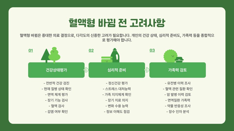 혈액형을 바꾸기로 결정하기 전에 몇 가지 중요한 사항을 고려해야 합니다. 첫 번째는 개인의 건강 상태입니다. 기존의 건강 문제나 특정 질병 이력이 있다면, 혈액형 변경이 적합한지 면밀히 분석해야 합니다. 신체의 전체적인 상태가 혈액형 변경의 필요성을 결정할 수 있습니다.
