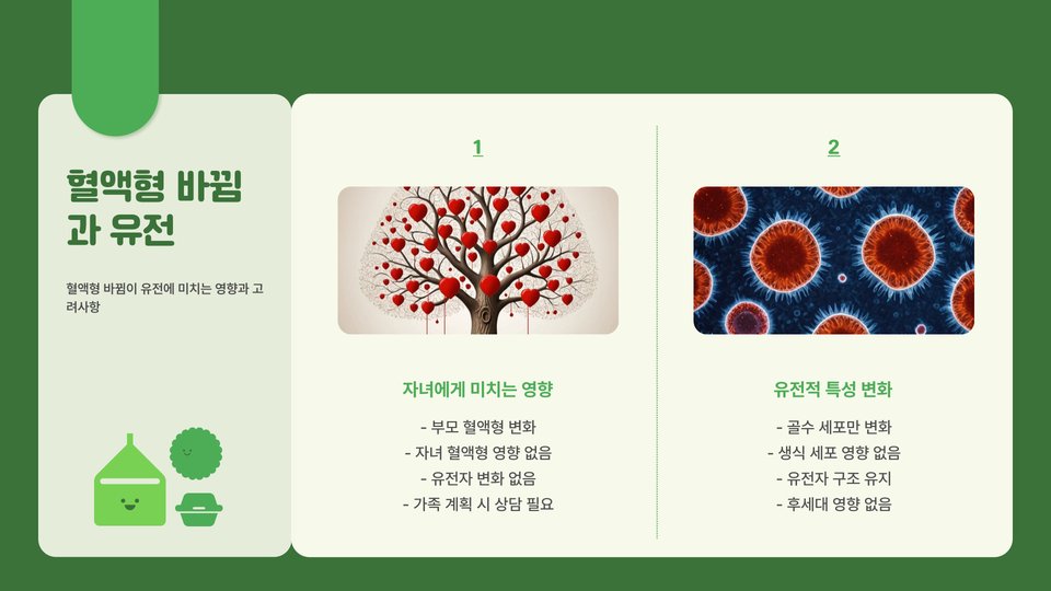 - 개인의 건강 관리를 위해 혈액형 변경 고려 가능.