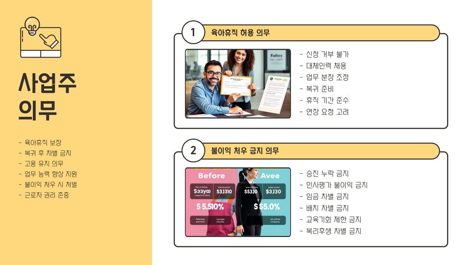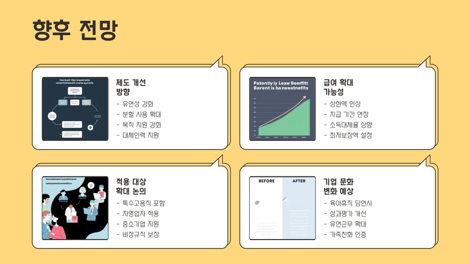부부가 동시에 육아휴직을 사용할 수 있도록 특례가 적용되어, 각각 최대 1년씩 가질 수 있는 점은 특히 주목할 만합니다. 이러한 변화로 인해 육아의 부당한 부담을 부모 두 명이 나누어 가질 수 있어 가족의 안정성 또한 높아질 것으로 기대됩니다. 예를 들어, 아버지가 첫 3개월 간 휴직을 사용하고, 그 후 어머니가 같은 자녀에 대해 1년 간 육아휴직을 사용할 수 있는 구조를 통해 더 많은 육아 참여가 가능해집니다.