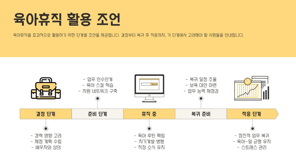 예를 들어, 주 2~3일 근무를 하면서 나머지 시간을 육아에 전념할 수 있는 방법을 고려해볼 수 있습니다. 이 경우, 근로시간이 줄어들기 때문에 급여는 감소하겠지만, 육아와 일을 동시에 병행하는 유연성을 가질 수 있습니다. 근로시간 조정은 고용주와의 협의가 필요하므로, 미리 의논하고 계획하는 것이 좋습니다.
