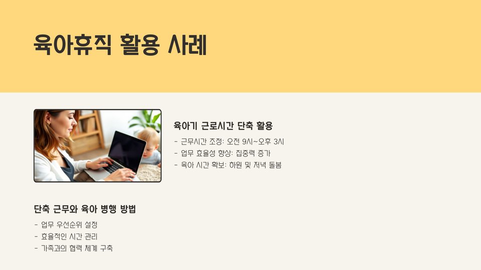 예를 들어, 주 2~3일 근무를 하면서 나머지 시간을 육아에 전념할 수 있는 방법을 고려해볼 수 있습니다. 이 경우, 근로시간이 줄어들기 때문에 급여는 감소하겠지만, 육아와 일을 동시에 병행하는 유연성을 가질 수 있습니다. 근로시간 조정은 고용주와의 협의가 필요하므로, 미리 의논하고 계획하는 것이 좋습니다.