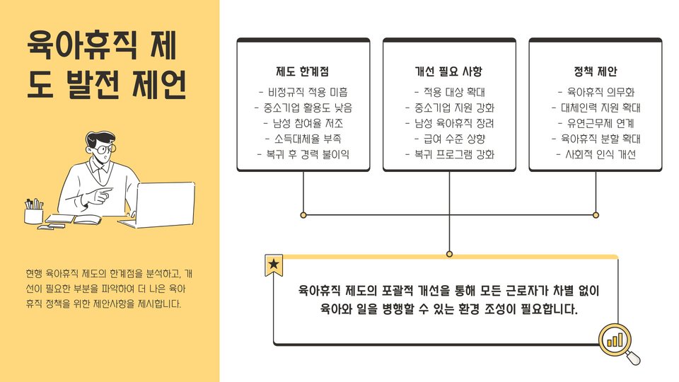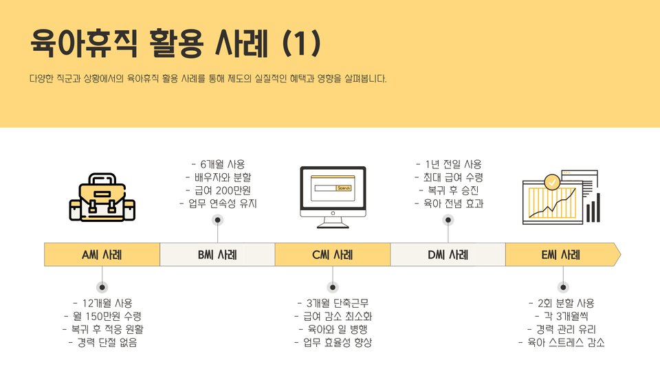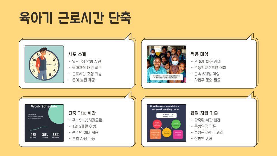 예를 들어, 주 2~3일 근무를 하면서 나머지 시간을 육아에 전념할 수 있는 방법을 고려해볼 수 있습니다. 이 경우, 근로시간이 줄어들기 때문에 급여는 감소하겠지만, 육아와 일을 동시에 병행하는 유연성을 가질 수 있습니다. 근로시간 조정은 고용주와의 협의가 필요하므로, 미리 의논하고 계획하는 것이 좋습니다.