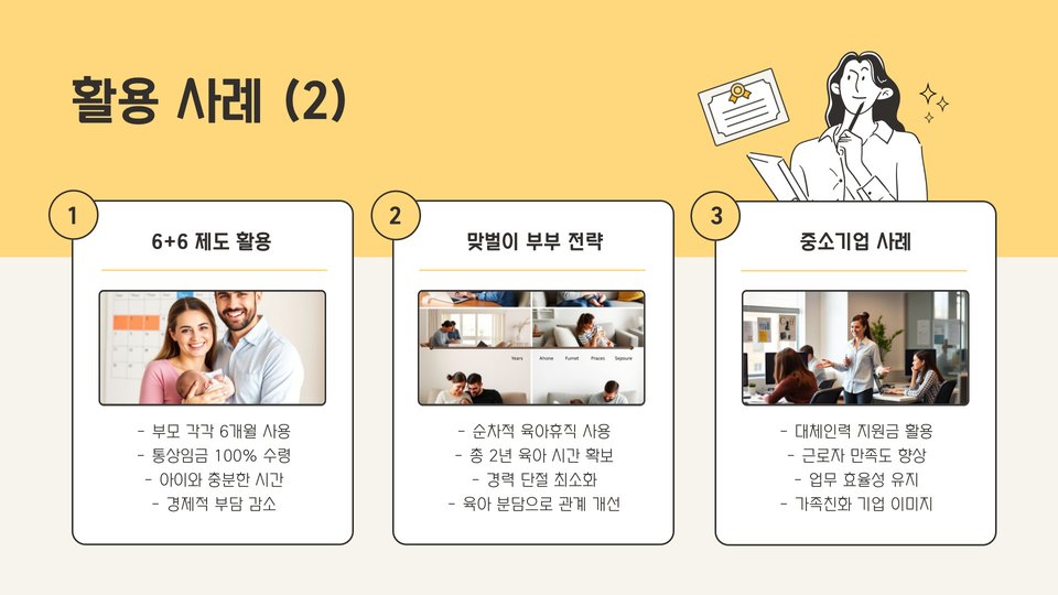 부부가 동시에 육아휴직을 사용할 수 있도록 특례가 적용되어, 각각 최대 1년씩 가질 수 있는 점은 특히 주목할 만합니다. 이러한 변화로 인해 육아의 부당한 부담을 부모 두 명이 나누어 가질 수 있어 가족의 안정성 또한 높아질 것으로 기대됩니다. 예를 들어, 아버지가 첫 3개월 간 휴직을 사용하고, 그 후 어머니가 같은 자녀에 대해 1년 간 육아휴직을 사용할 수 있는 구조를 통해 더 많은 육아 참여가 가능해집니다.
