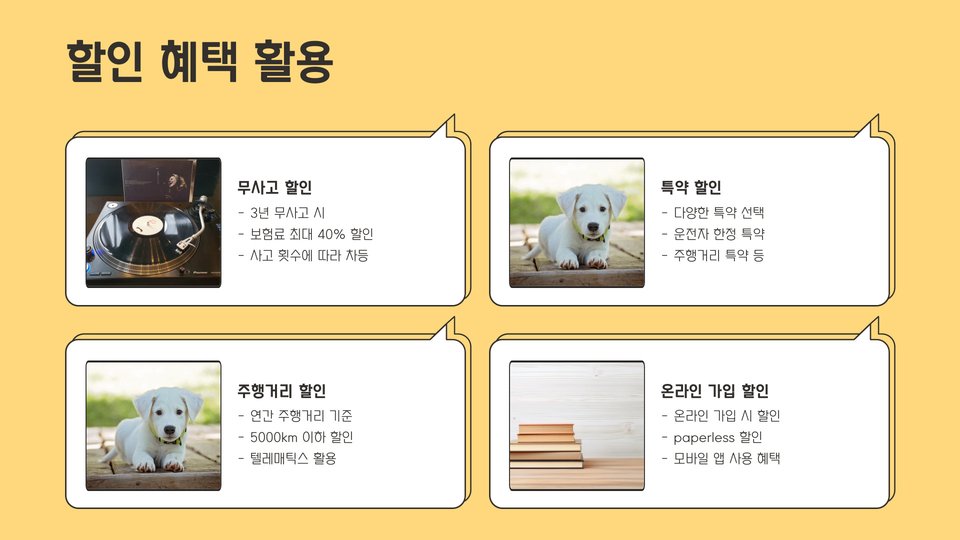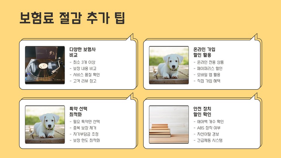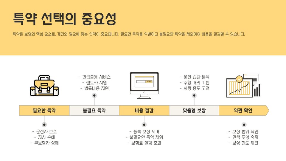 각 보험사는 기본 보험 외에 다양한 특약과 할인 혜택을 제공하고 있습니다. 예를 들어, 학생 운전자를 위한 할인, 보험을 여러 대에 가입했을 때 제공되는 멀티 자동차 할인, 안전운전 할인을 고려할 수 있습니다. 이러한 특약을 활용하면 보험료를 대폭 줄일 수 있습니다.