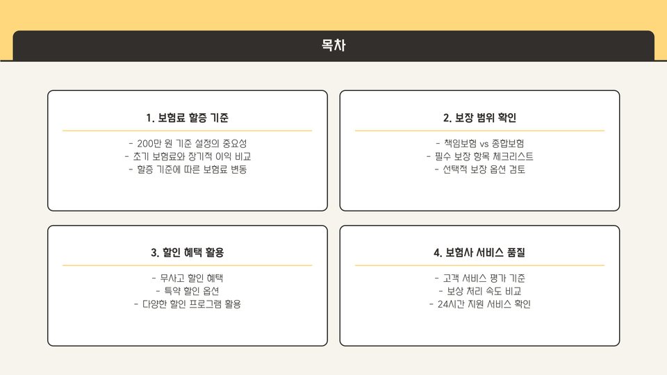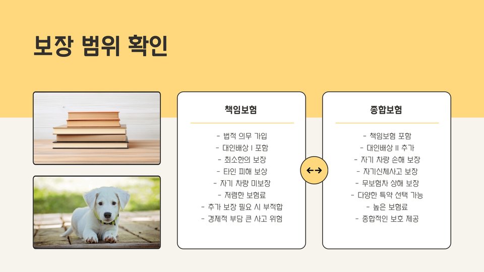 보험 상품의 보장 내용은 보험을 선택하는 데 중요한 기준입니다. 일반적으로 자차 손해 보장, 타인 배상 책임, 상해 치료비 등을 포함합니다. 이러한 보장 항목이 어떤 상황에서 적용되는지, 그리고 한도는 얼마인지 정확히 이해하는 것이 필요합니다. 보장 내용이 부족하면 사고 발생 시 큰 손해를 볼 수 있으므로 유의해야 합니다.