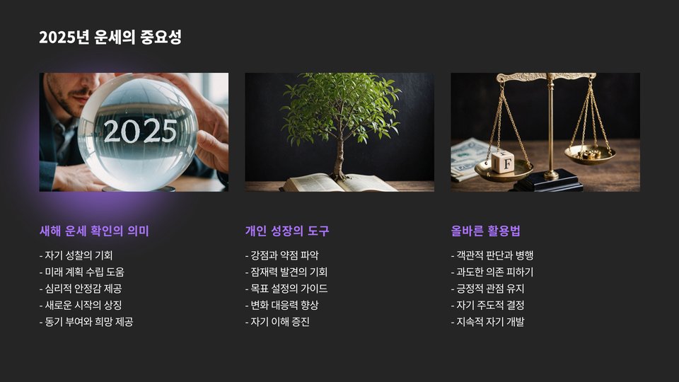 운세는 단순한 재미를 넘어, 우리의 결정을 돕는 중요한 도구가 될 수 있습니다. 2025년 무료운세를 통해 우리는 다가오는 해에 대한 방향성을 찾을 수 있습니다. 예를 들어, 직장 내 변화나 새로운 인연을 만나는 시기를 예측할 수 있습니다. 이러한 예측은 우리가 최선의 결정을 내리도록 도와줍니다.