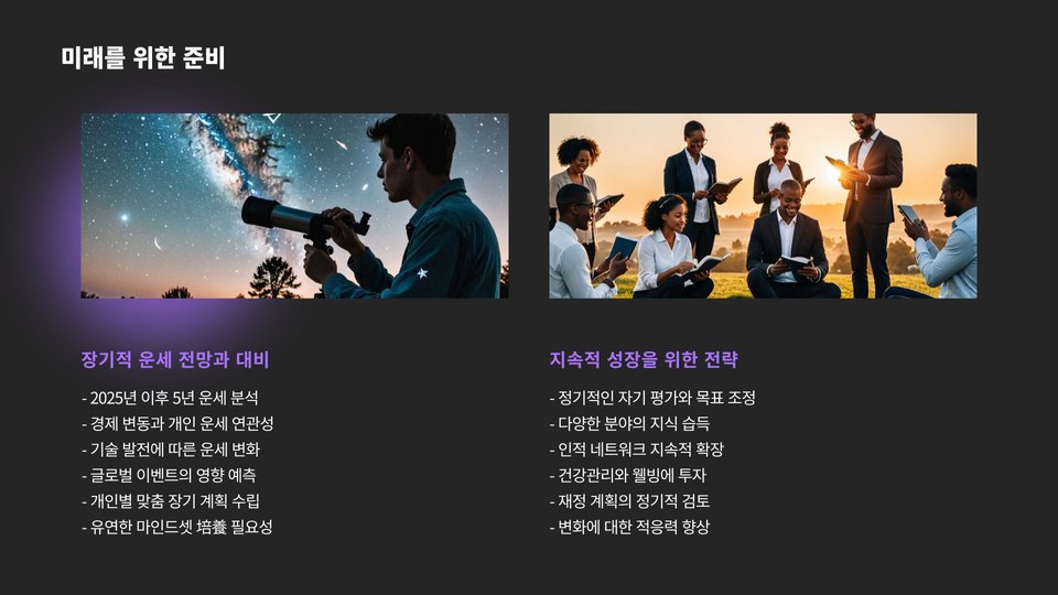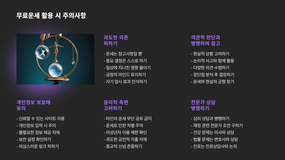 셋째, 운세를 주기적으로 체크하여 변화하는 상황에 맞게 계획을 조정하는 것이 중요합니다. 운세는 정적인 것이 아니라 변화하는 요소이기 때문에, 주기적으로 점검하는 것이 필요합니다. 넷째, 주변 사람들과 운세에 대한 이야기를 나누며 다양한 관점을 공유하는 것도 큰 도움이 됩니다.