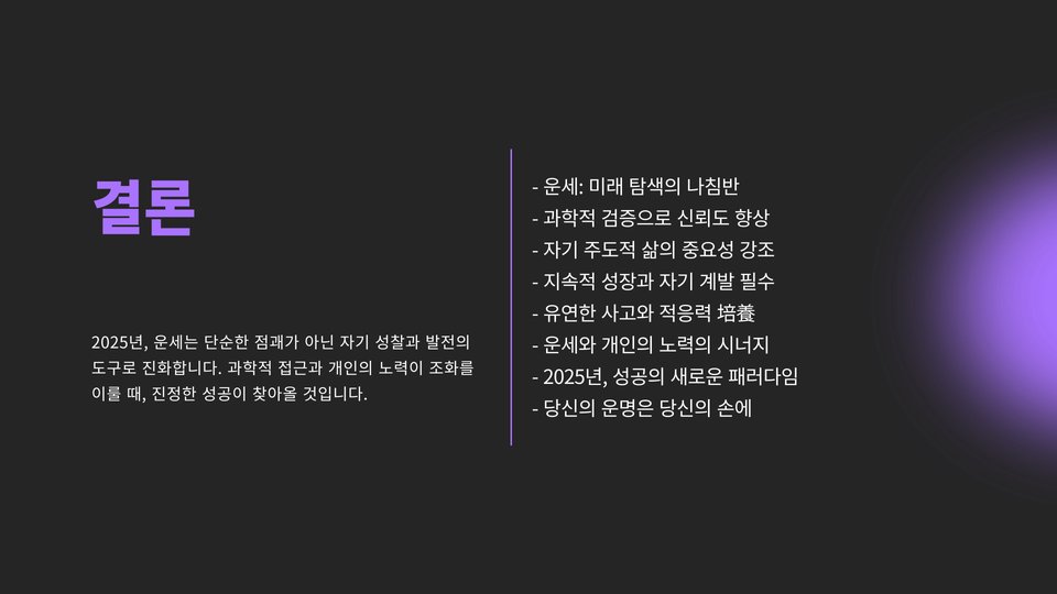 2025년 무료운세는 여러분의 삶에 긍정적인 영향을 미칠 수 있는 훌륭한 도구입니다. 무료운세를 통해 얻은 정보는 여러분의 선택과 계획에 큰 도움이 될 것입니다. 위에서 소개한 TOP 10 검증된 성공 비법을 바탕으로, 자신만의 운세 활용법을 찾아보길 바랍니다. 2025년을 더욱 의미 있게 보내세요!