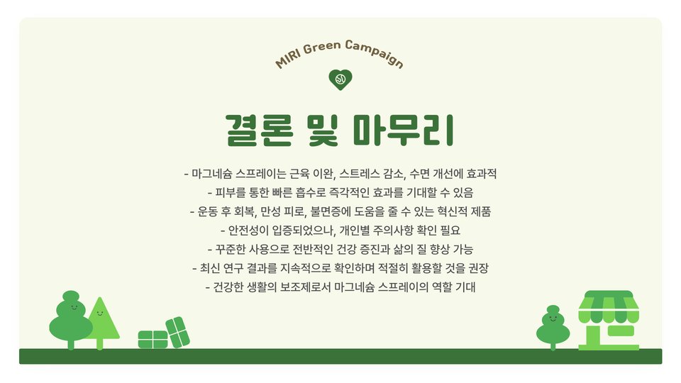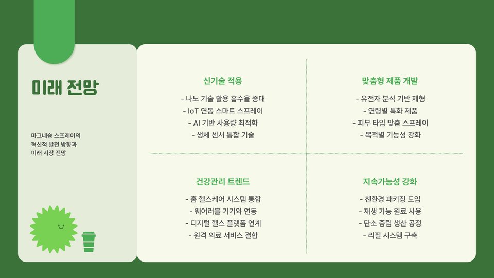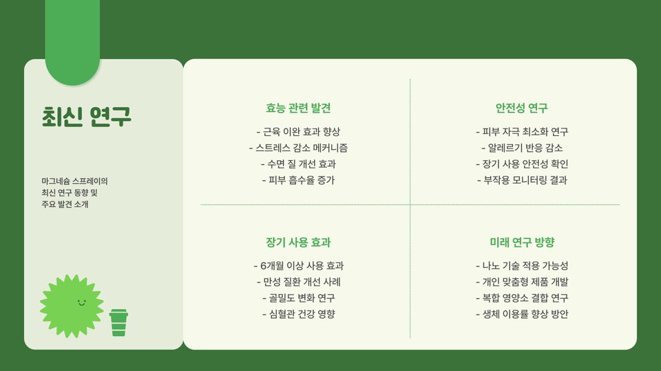 마그네슘 스프레이는 운동 후 근육통 완화, 스트레스 감소 및 숙면 유도에 효과적인 제품입니다. 이러한 효능 덕분에 많은 사람들이 일상 생활에서 마그네슘 스프레이를 적극적으로 활용하고 있습니다. 정기적으로 사용하고 적절한 방법으로 관리한다면, 더욱 건강한 생활을 유지하는 데 큰 도움이 될 것입니다.