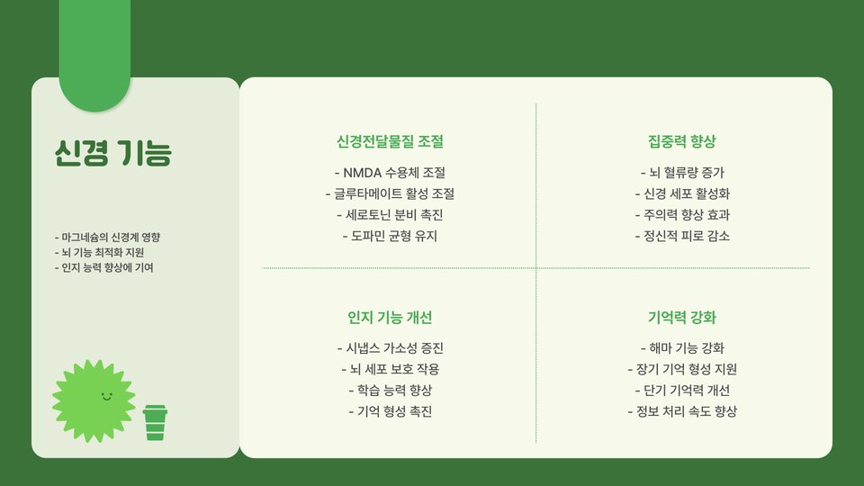 - 마그네슘은 근육 이완과 통증 완화에 효과적이다.