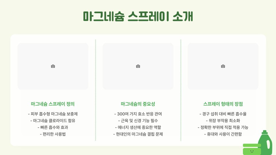 마그네슘은 우리 몸에 중요한 역할을 하는 미네랄 중 하나로, 특히 근육 이완에 큰 영향을 미칩니다. 마그네슘 스프레이는 이러한 마그네슘을 피부를 통해 직접 흡수할 수 있도록 도와주는 제품입니다. 최근 많은 사람들이 마그네슘 스프레이를 사용하여 근육통을 완화하고, 피로를 줄이며, 전반적인 건강을 개선하고 있습니다. 이 글에서는 2025년 최신 마그네슘 스프레이의 효능에 대해 깊이 알아보겠습니다.