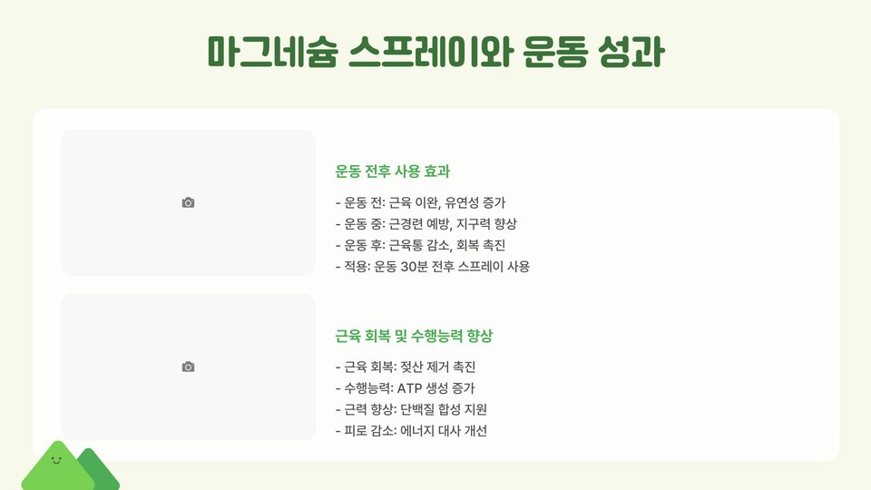 마그네슘 스프레이의 대표적인 효능 중 하나는 근육통 완화입니다. 운동 후 발생하는 근육통은 보통 근육의 긴장으로 인해 발생하는데, 마그네슘이 근육의 이완을 도와줌으로써 통증을 줄여줍니다. 또한, 마그네슘은 스트레스와 긴장을 완화하는 데도 효과적입니다. 쉽게 생각해보면, 정신적 스트레스를 받을 때는 몸이 긴장하게 되는데, 마그네슘이 이를 이완시켜 주는 역할을 합니다.