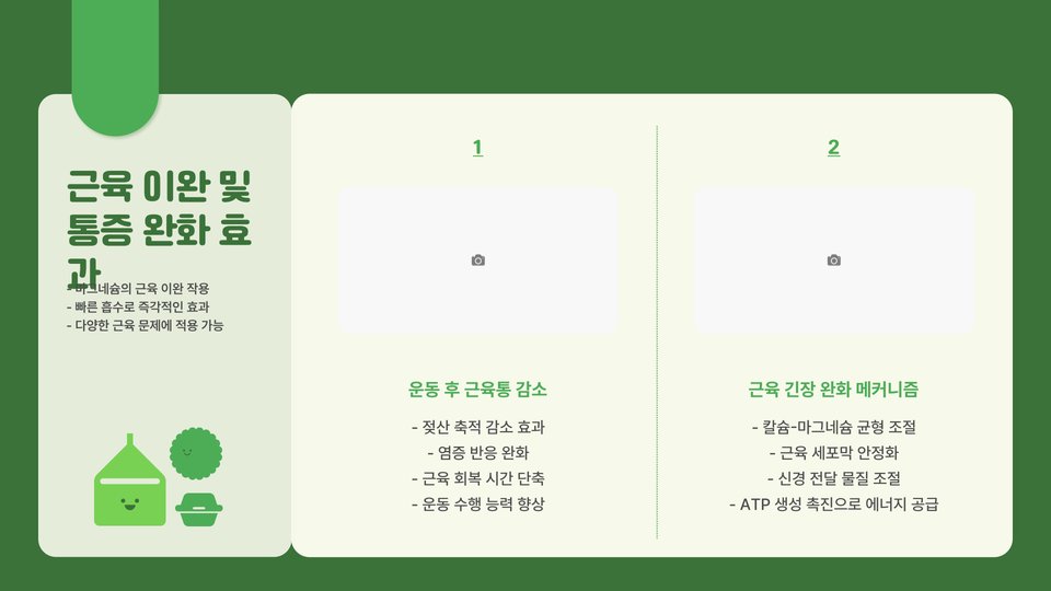 - 마그네슘은 근육 이완과 통증 완화에 효과적이다.