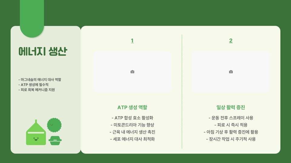 마그네슘 스프레이는 근육통 완화와 스트레스 감소에 효과적입니다. 운동 후 뭉친 근육에 뿌리면 통증을 완화하고, 근육의 긴장을 줄여줍니다. 특히, 마그네슘은 근육 이완에 중요한 역할을 하므로, 운동 후 회복에 큰 도움을 줍니다. 또한, 스트레스를 줄이는 데도 효과적이며, 심리적 안정감을 제공하는 데 기여합니다.
