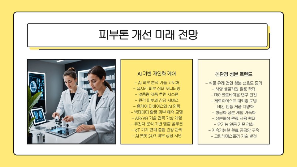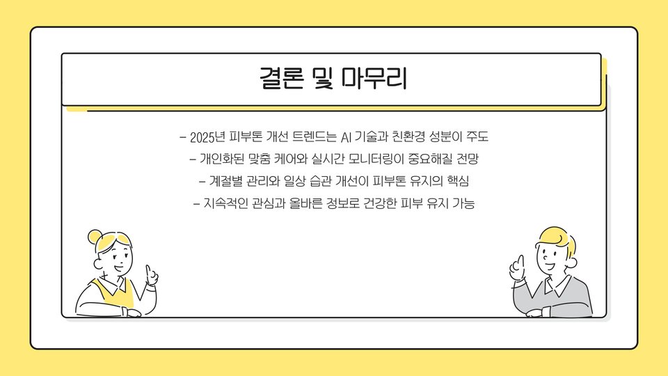 2025년 피부톤 개선을 위해서는 자신의 피부톤을 정확히 이해하고, 이에 맞춘 스킨케어와 메이크업을 선택하는 것이 중요합니다. 또한, 자연 친화적인 성분과 맞춤형 스킨케어 루틴을 통해 건강한 피부를 유지할 수 있습니다. 피부톤 개선은 단순한 외적인 변화가 아니라, 건강한 피부를 위한 노력의 결과임을 잊지 마세요.