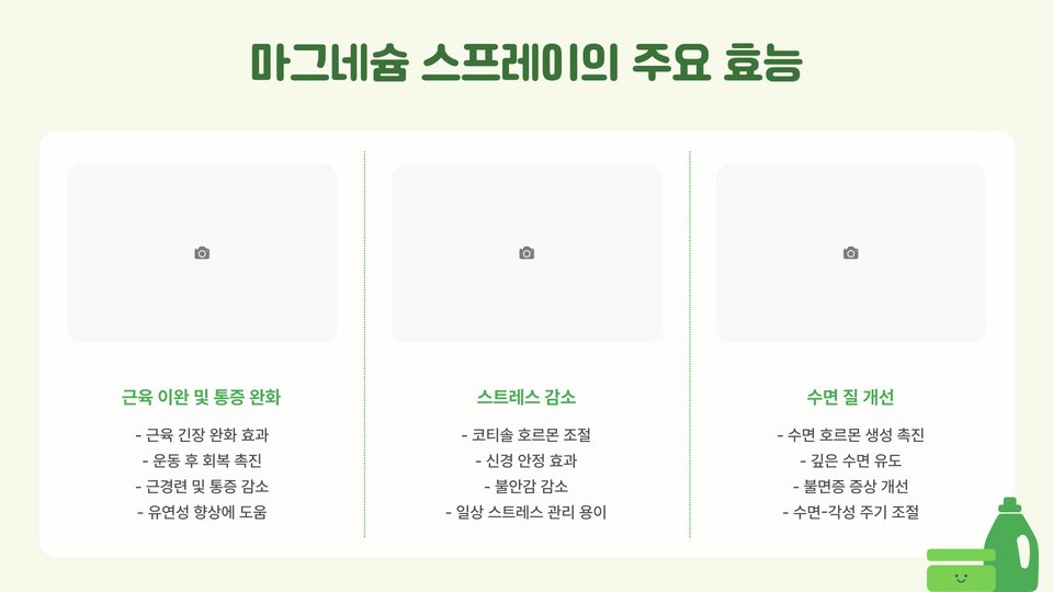 마그네슘 스프레이는 근육통 완화와 스트레스 감소에 효과적입니다. 운동 후 뭉친 근육에 뿌리면 통증을 완화하고, 근육의 긴장을 줄여줍니다. 특히, 마그네슘은 근육 이완에 중요한 역할을 하므로, 운동 후 회복에 큰 도움을 줍니다. 또한, 스트레스를 줄이는 데도 효과적이며, 심리적 안정감을 제공하는 데 기여합니다.