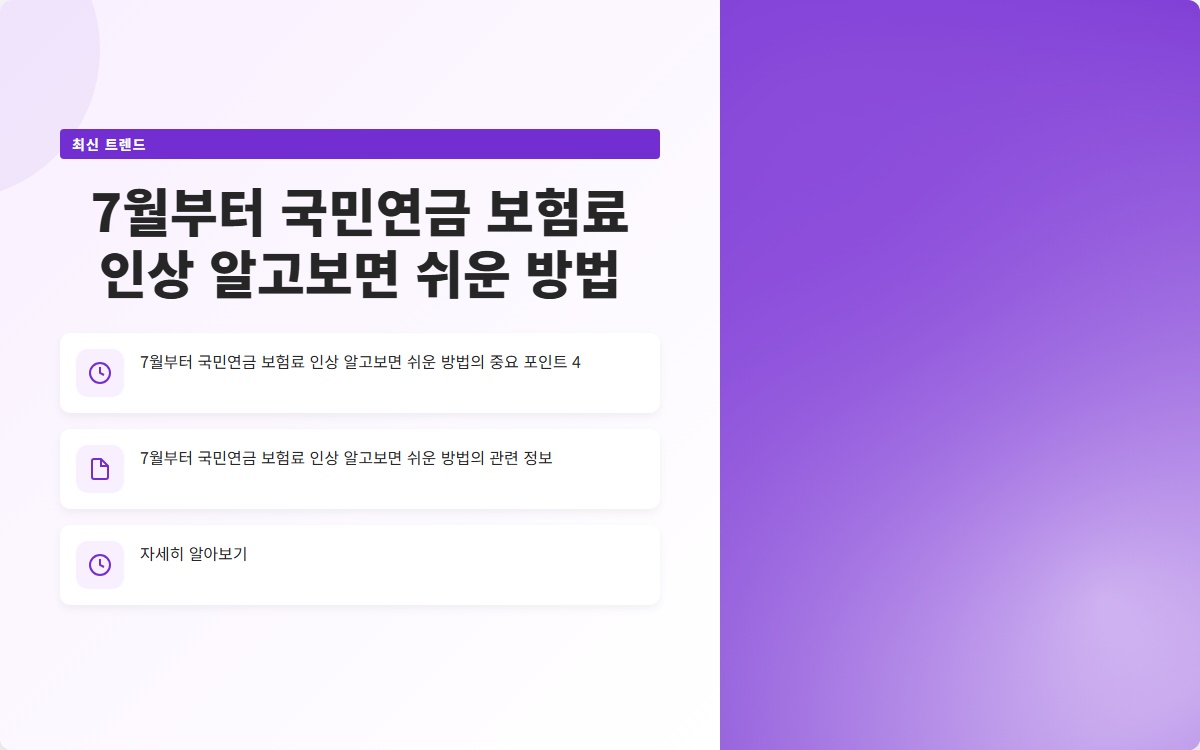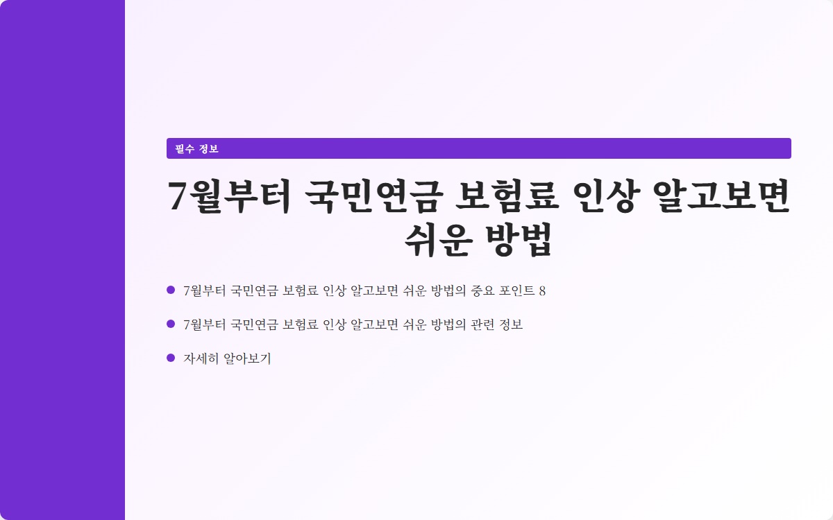 국민연금 보험료가 2025년 7월부터 인상된다는 사실, 알고 계셨나요? 많은 분들이 이 변화를 간과하고 계실 가능성이 높습니다. 소득에 따라 달라지는 보험료를 미리 파악하는 것이 중요합니다. 지금 확인해보세요!
