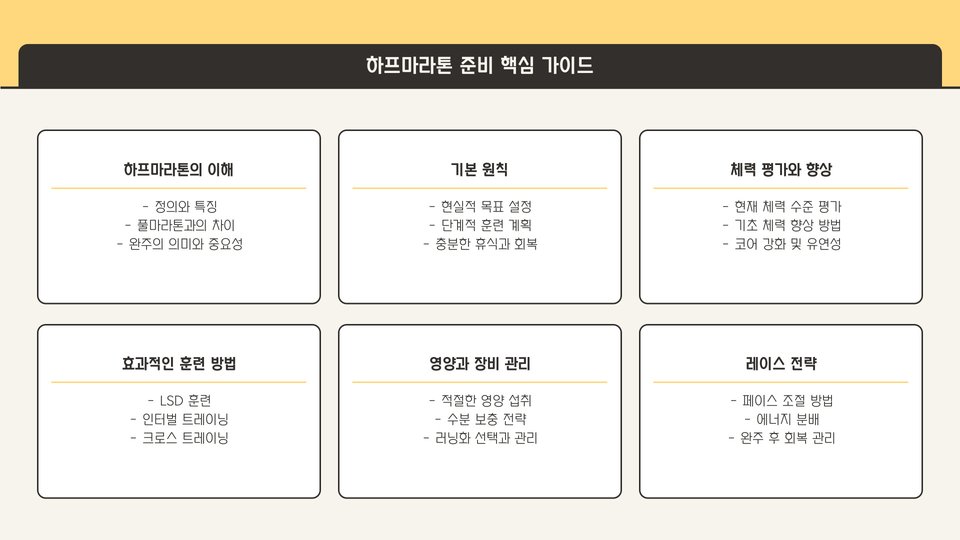 Tags: 하프마라톤, 마라톤 연습, 훈련 계획, 영양 관리, 정신적 준비, 부상 예방, 운동 팁, 마라톤 준비, 달리기, 체력 관리