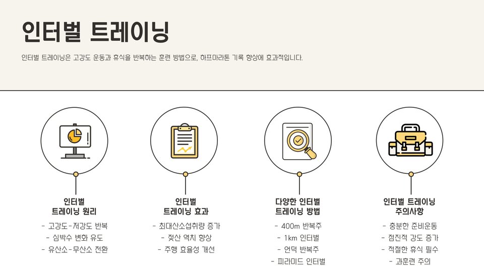 장거리 달리기는 하프마라톤의 거리를 소화하는 데 필수적입니다. 매주 하나의 장거리 훈련을 포함시켜야 하며, 거리를 점진적으로 늘려가는 것이 중요합니다. 첫 주에는 10km를 목표로 하여, 매주 1~2km씩 증가시키는 방식으로 진행해 보세요.