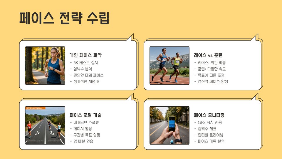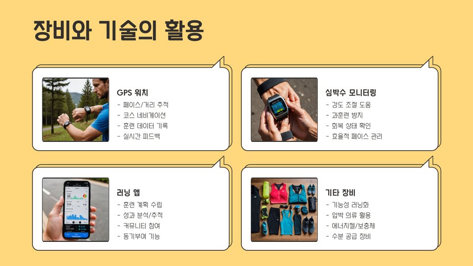 훈련 계획에는 장거리 달리기, 속도 훈련, 회복 운동이 포함되어야 합니다. 장거리 달리기는 실제 경주를 대비하는 데 도움을 주며, 속도 훈련은 최대한 빠르게 달리는 능력을 키워줍니다. 회복 운동은 부상 방지와 체력 회복에 큰 역할을 합니다.