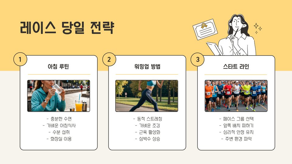 레이스 당일, 출발 전에는 정신을 집중하는 것도 유용합니다. 저는 명상이나 호흡 연습을 통해 마음을 안정시킵니다. 이러한 방법들은 긴장감을 줄이고, 코스에 대한 집중력을 높여 줍니다.