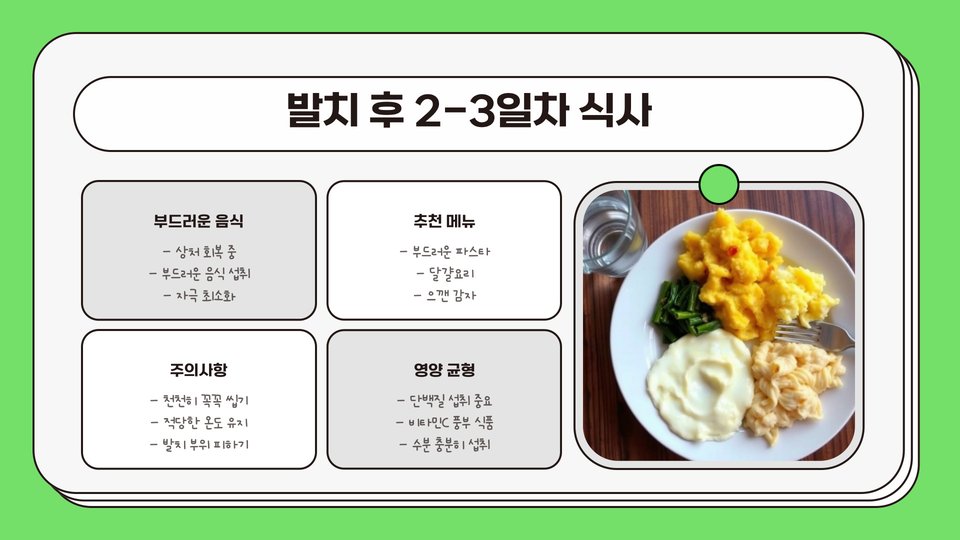 식사 시 주의해야 할 점은, 음식의 질감과 온도입니다. 예를 들어, 부드러운 바나나스무디는 좋은 선택입니다. 또한, 발치 후 24시간 동안은 음식을 먹지 않는 것이 좋고, 이후에는 점차 부드러운 음식을 추가하는 것이 이상적입니다.