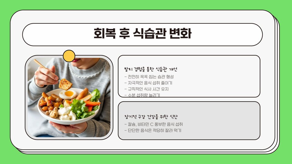 마지막으로, 충분한 수분 섭취가 중요합니다. 염증을 줄이기 위해 수분을 잘 챙기는 것이 좋습니다. 물뿐만 아니라 부드러운 차나 스프도 좋은 선택입니다. 너무 뜨겁지 않도록 주의하세요.